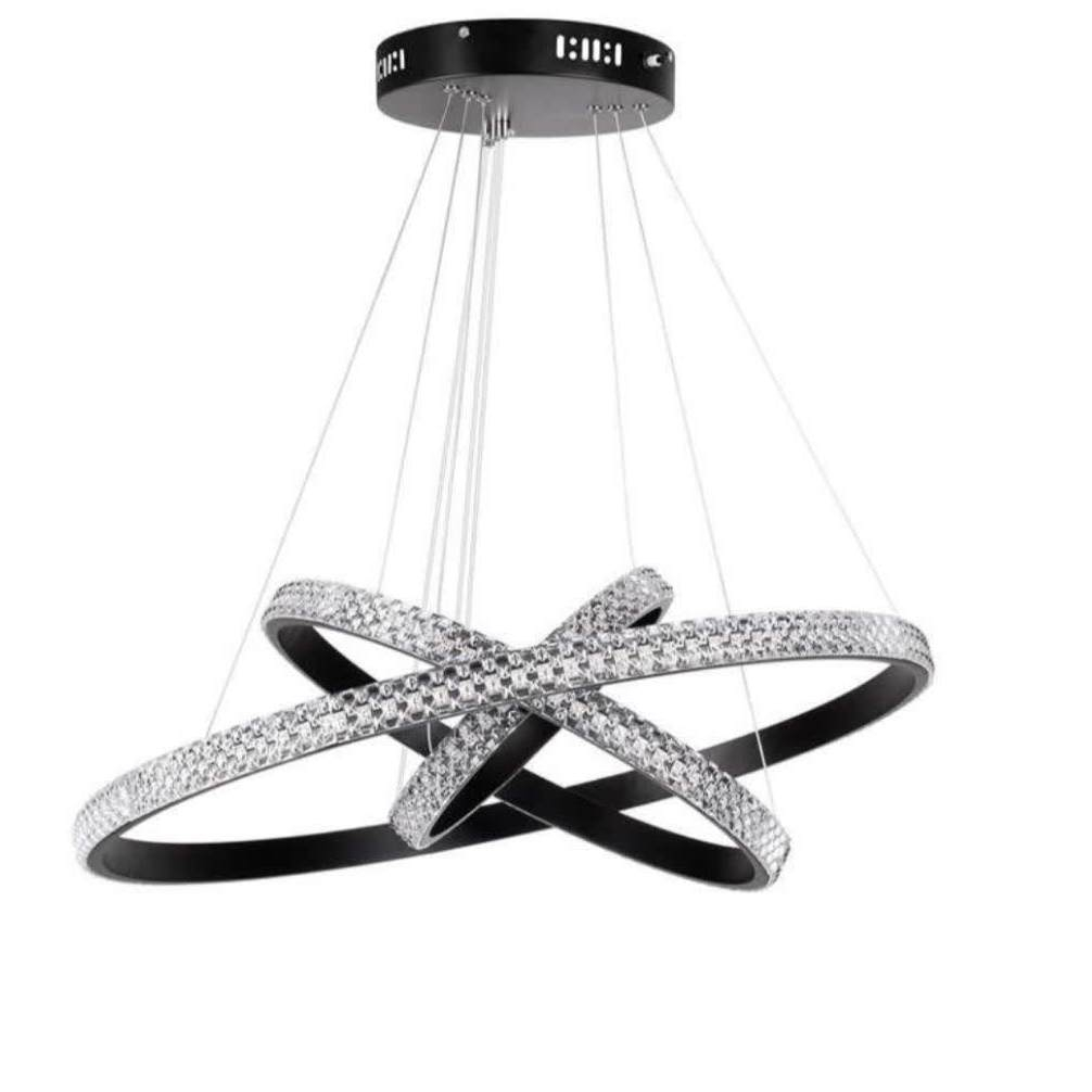 لوستر مدرن سه حلقه کریستالی نور از بیرون با ابعاد 60-40-20 سانتی متر تولید شده مناسب سالن و آشپزخانه که با رنگ بدنه مشکی مات استاتیک،در رنگ سه حالته نوری ارائه میشود، لوستر مدرن دارای ریموت کنترل هست که از امکانات ریموت میتوان به کم زیاد کردن نور،حالت شب و اپلیکیشن موبایل (کم وزیاد کردن نور،تغییر طیف نوری،تنظیم زمان برای روشن شدن یا خاموش شدن خودکار) اشاره کرد